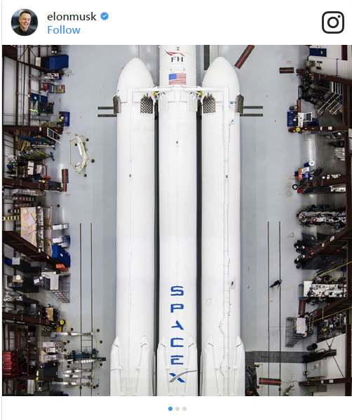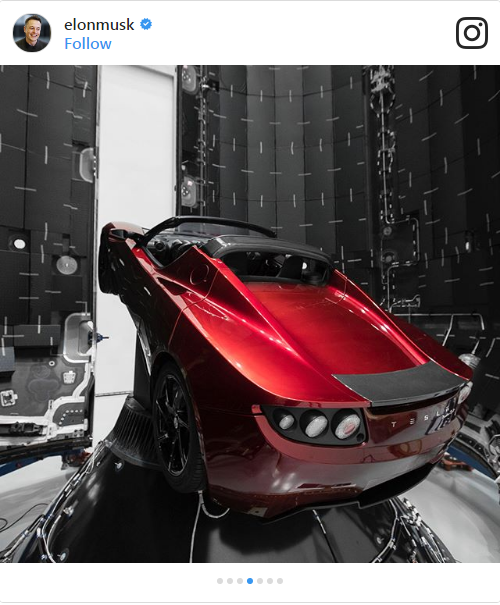 Основатель SpaceX и Tesla Илон Маск опубликовал в своем Instagram фотографию автомобиля, который будет запущен в направлении Марса на ракете Falcon Heavy в качестве нагрузки.