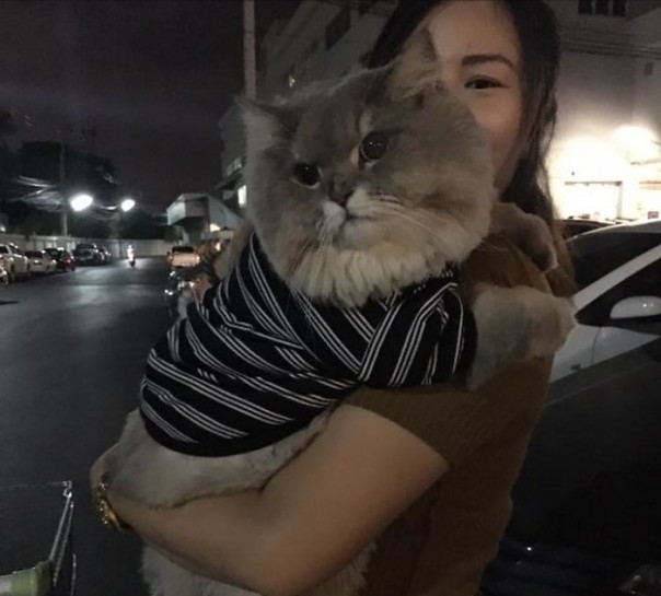 Котик живет в Таиланде. Там его любят и балуют. Каждый, кто с ним встречается, делает с ним фотографию на память и поглаживает его брюхо. Причем всё это абсолютно бесплатно.
