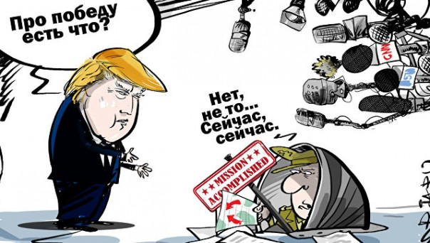 Трамп говорил, что готов был бороться с ИГ* в сотрудничестве "с любым государством региона, которому угрожает этот терроризм", но при условии, "что они будут хорошо себя вести по отношению к США и не забудут того, что мы для них сделали". То есть вместе с Россией и, возможно, даже Ираном с Сирией. Смысл этой борьбы был не в том, что США не могли победить в одиночку, а в том, что совместная борьба против мирового зла (каковым и является ИГ*) должна была создать некую атмосферу доверия между американцами и их идеологическими противниками. И уже на основе этой атмосферы доверия Америка могла бы нормализовывать с ними отношения. Нормализации в итоге не получилось — США не просто отказывались конструктивно работать с россиянами, иранцам и сирийцами, но еще и регулярно помогали ИГ* (считая, возможно, террористов менее опасными врагами, чем восстанавливающий контроль над Левантом Иран или же активно возвращающуюся в регион Россию).