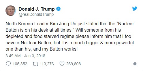 Таким образом президент Соединённых Штатов прокомментировал слова главы КНДР о готовности нанести удар по США в любой момент, если понадобится. Это заявление Ким Чен Ын сделал во время новогоднего обращения к нации. Отметив, что к 2018 году стране удалось «усовершенствовать ядерные вооружённые силы», он сообщил, что вся территория США находится под прицелом.