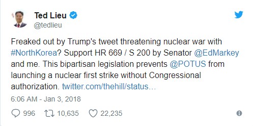 Обеспокоенность не только угрозами Северной Кореей, но и заявлениями Дональда Трампа высказали и в американском конгрессе. Так, демократ Тед Лиу заявил, что обезопасить США от возможной ядерной войны с КНДР сможет продвигаемый им закон. Согласно ему, президент не может принимать самостоятельные решения о нанесении удара.