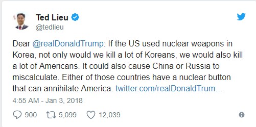 «Вас сводит c ума твит Трампа с угрозой ядерной войны с КНДР? Поддержите мой с сенатором Эдом Марки законопроект 660/S200. Этот законопроект от представителей обеих партий не позволит президенту США первым нанести ядерный удар без разрешения конгресса», — написал Лиу в Twitter.