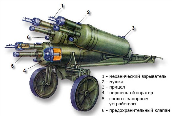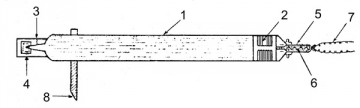 Фугасный огнемет «СПС». 1 — камера для горючего; 2 — поршень; 3 — сопло; 4 — терочные свечи зажигательного патрона; 5 — зарядник; 6 — пороховой выбрасывающий патрон; 7 — провода от подрывной машинки; 8 — штырь.