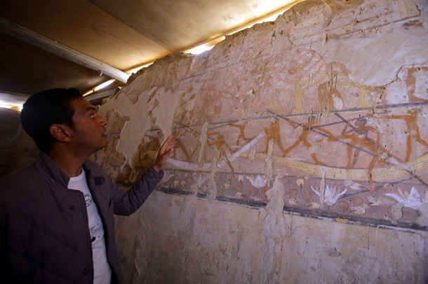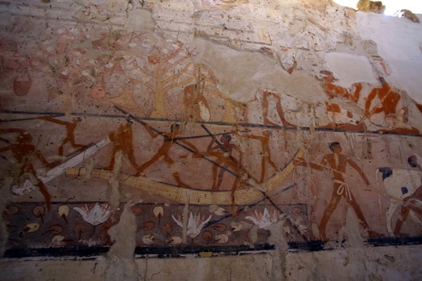 В гробнице из глиняных кирпичей обнаружены картины в хорошем состоянии, изображающие сцены охоты и рыбалки с участием самой Хетпет.