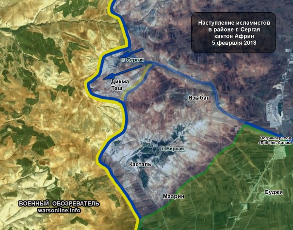 5 февраля несколько штурмовых групп боевиков-исламистов из так называемой «Свободной сирийской армии» (ССА) атаковали позиции курдских «Отрядов народной самообороны» (YPG) у горы Сергая на северо-восточном участке фронта в регионе Африн. Атаки шли одновременно с территории Сирии и Турции. Основные штурмовые группы атаковали с турецкой территории под прикрытием артиллерии и авиации ВС Турции.