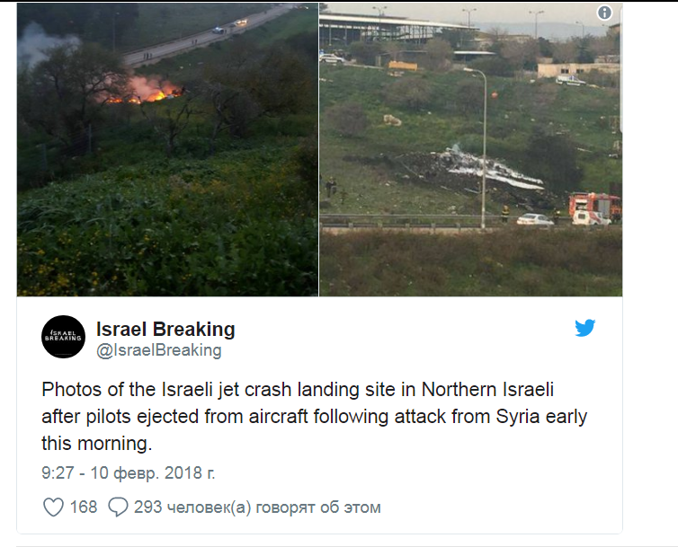 Фото с места падения сбитого Сирией израильского истребителя