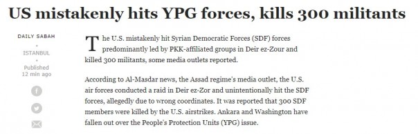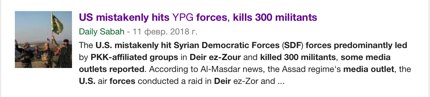 Итак, 2 дня назад в турецком издании Daily Sabah появляется статья с названием «США по ошибке нанесли удар по курдам из Сирийской демократической коалиции в юго-восточном регионе провинции Дейр-эз-Зор». В ней говорится, что по сообщению сирийского проправительственного СМИ, воздушные силы США провели рейд в Дейр-эз-Зор и неумышленно ударил по SDF, якобы из-за неправильных координат. Было сообщено, что 300 курдов были убиты американскими воздушными ударами.