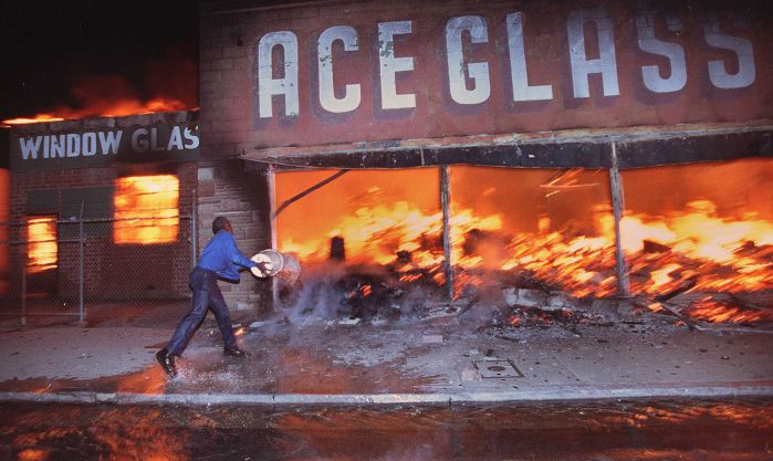 Слабость и нерешительность полиции быстро распалила бунтовщиков. Впоследствии копов много обвиняли в бездеятельности, и претензии к полицейскому руководству трудно назвать необоснованными. Вечером начались поджоги магазинов, домов и даже административных зданий. Пожарным пришлось ездить на задания в бронежилетах, но им далеко не всегда удавалось вовремя добраться до очагов возгорания по кипящим улицам. Пожарные, как и медики, ездили на вызовы в сопровождении вооружённой охраны, иначе было легко лишиться и оборудования, и машин, и самой жизни.