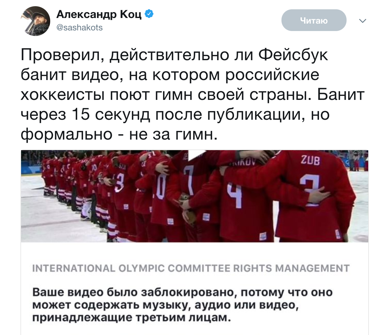 Не потому ли в Фэйсбуке стали судорожно подтирать видео с исполнением гимна нашими хоккеистами?