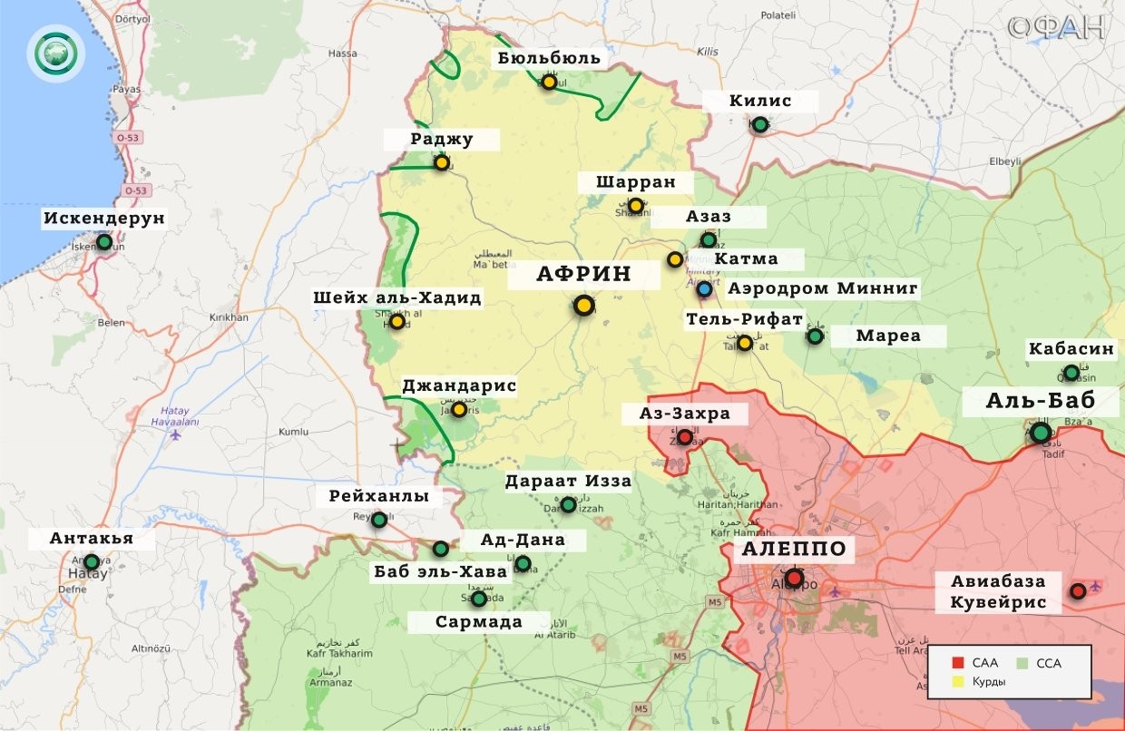 Информационное агентство Anadolu Agency сообщает о том, что вся сирийско-турецкая граница, пролегающая через Африн, была оккупирована силами Турции и союзной им Сирийской свободной армии (ССА). Вследствие этого протурецкие радикалы получили возможность поставлять оружие и боеприпасы из Идлиба в район города Азаз, находящегося в северной части провинции, в обход контролируемых курдами районов.