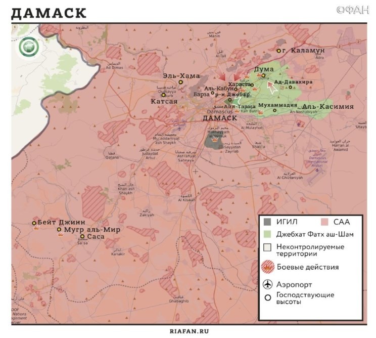 25 февраля САА и ее союзники начали наземную часть операции против боевиков в расположенном возле Дамаска регионе Восточная Гута. С момента начала операции правительственные войска освободили населенные пункты Нашабия, Хазрама, Таль Фарзат и Салихия, а также отразили атаку Хайят Тахрир аш-Шам* (бывшая Джебхат ан-Нусра*) в северной части котла.