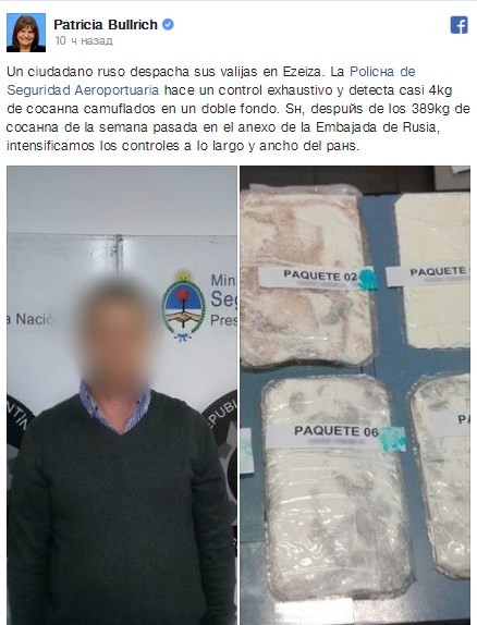 По словам Буллрич, пока рано судить о связи между этим делом и попыткой отправки в Россию почти 400 кг кокаина. Министр подчеркнула, что находится в постоянном контакте с послом РФ в Аргентине Виктором Коронелли.