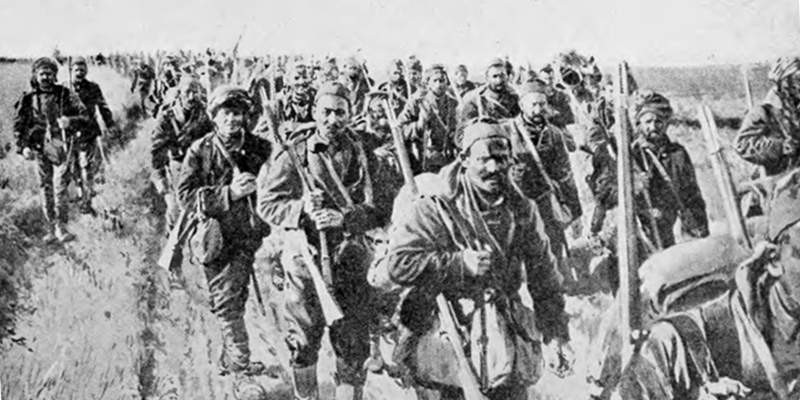 Сербские солдаты маршируют по сельской местности. 1914