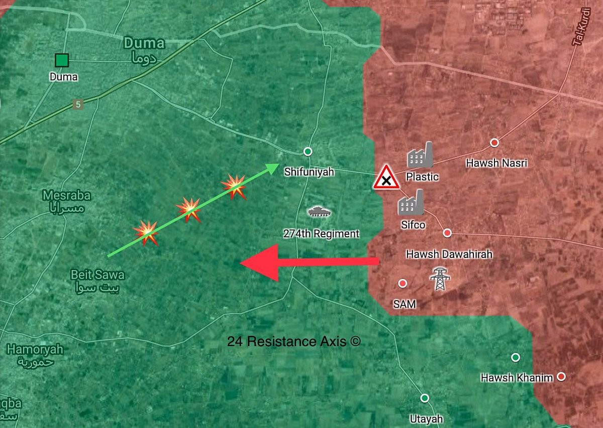 Сирийская арабская армия (САА) продолжает планомерно продвигаться на северо-востоке Дамаска. Согласно информации новостного портала Al Masdar News, правительственным силам удалось захватить военную базу батальона 274, которая в течение многих лет контролировалась радикалами группировки «Джейш Аль-Ислам». Боевики бежали с места боевых действий в направлении города Аль-Шифуния, который теперь находится в окружении с двух сторон. Однако в ходе столкновений у населенного пункта Аль-Машаф были уничтожены два танка сил САР, о чем заявляют оппозиционный военный источник в сети Twitter (middleeastwars). Официальные интернет-порталы данные сведения, тем не менее, пока не подтверждали.