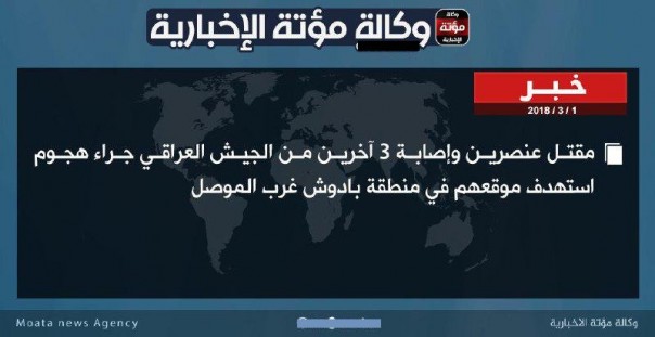 12:35 Запрещенная в России группировка ИГ* заявила об уничтожении троих солдат армии Ирака в окрестностях Мосула.