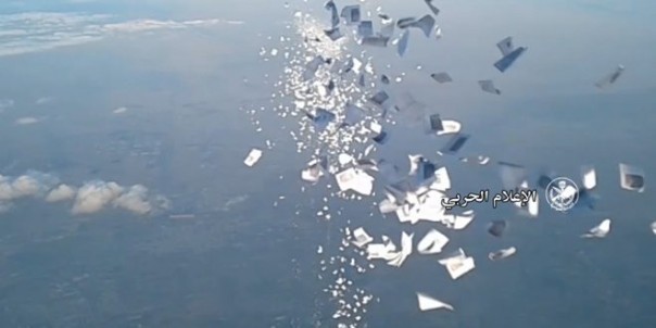 Вертолеты Сирийской армии разбросали сотни тысяч листовок над населенными пунктами Восточной Гуты, в которых указаны маршруты выхода к гуманитарному коридору, определенному для эвакуации граждан в районе лагеря Аль-Вафидин.