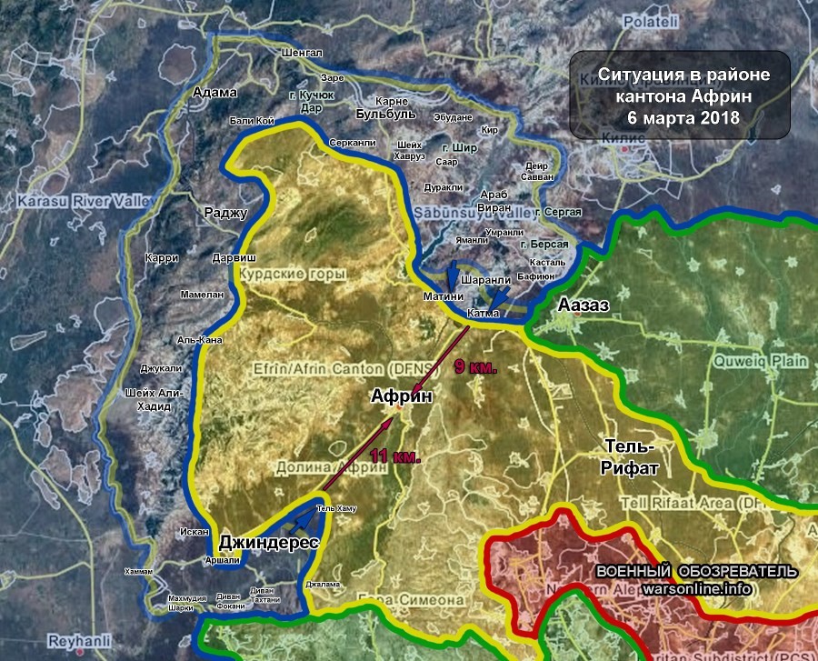 Во вторник, 6 марта 2018 г., войска исламистско-турецкого альянса продолжили наступление на северо-восточном и юго-западном участках фронта. В течение дня им удалось захватить до 4 селений и с обоих направлений приблизиться к административному центру региона г. Африн. Теперь с северо-востока турецкой армии до Африна около 9 километров, с юго-запада - около 11.