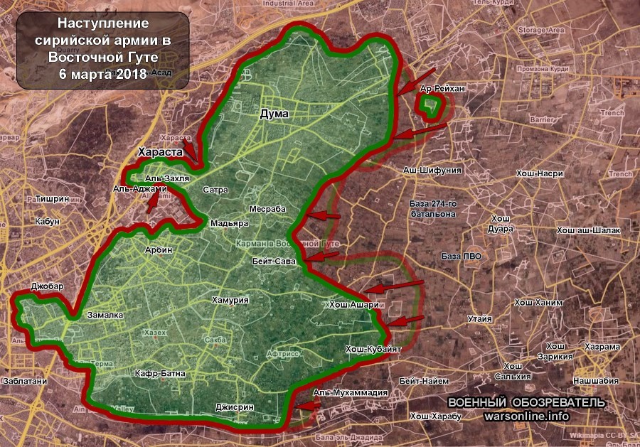 Во вторник, 6 марта 2018 г., сирийские правительственные войска при поддержке российской авиации продолжили наступление в Восточной Гуте. Как и в предыдущие трое суток продвижение шло в основном на восточном участке фронта.