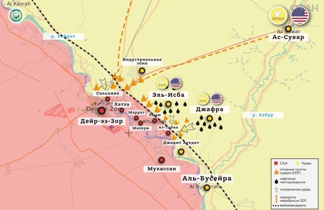 Дейр-эз-Зор, несомненно, является одним из ключевых направлений. Курды и американцы между тем, безусловно, хотели бы безраздельно властвовать на восточном побережье Евфрата, где находятся главные нефтяные месторождения. Потому этот регион вновь может стать зоной ожесточенных боевых действий, только борьбу SDF и САА теперь будут вести не против ИГ, а уже между собой.