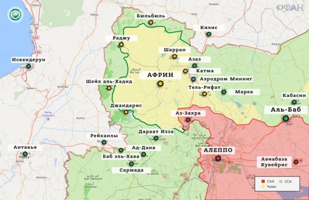 Севернее столицы региона не прекращаются столкновения между силами Сирийской свободной армии (ССА) и Турции с одной стороны и отрядами Демократической армии Сирии (SDF) с другой. По данным военного источника в сети Twitter (VivaRevolt), боевики ССА отбили у курдских бойцов деревню Халюби Сагира. По приблизительным данным, в настоящий момент протурецкие силы занимают территории в семи километрах от города Африн.