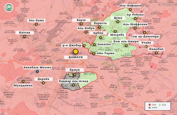 Во второй половине дня подразделения спецназа "Тигр" и союзных сил отбили у исламистов большую часть восточных предместий сирийской столицы. Под контроль правительственных войск перешли обширные районы с садами в окрестностях восточных пригородов Дамаска Месраба, Бейт-Сава и Хош аль-Ашари.