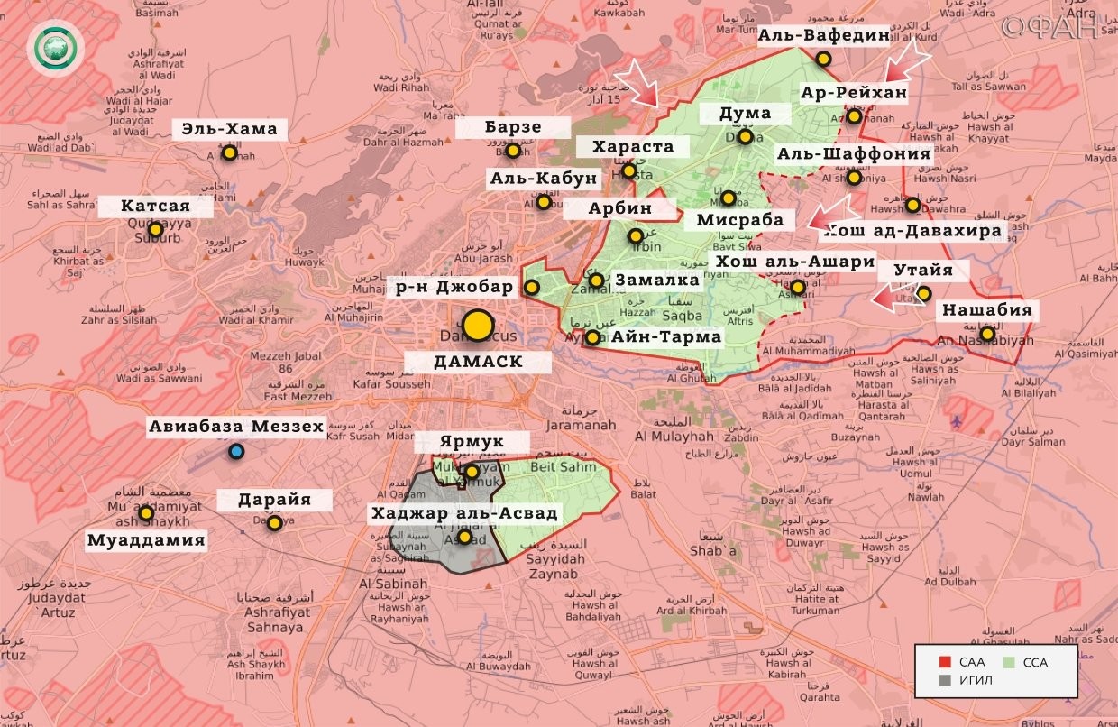 Сирийская арабская армия (САА) продвигается в Восточной Гуте. Ранее сообщалось, что правительственные войска САР выбили радикалов из нескольких поселений на юго-востоке Дамаска. В том числе САА заняла базу ПВО, которая находилась под контролем исламистов с 2012 года. По сведениям местных источников, от радикалов зачищено более половины территорий оазиса.