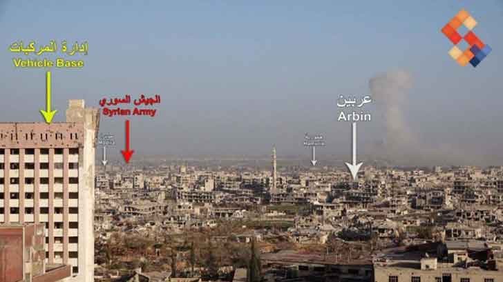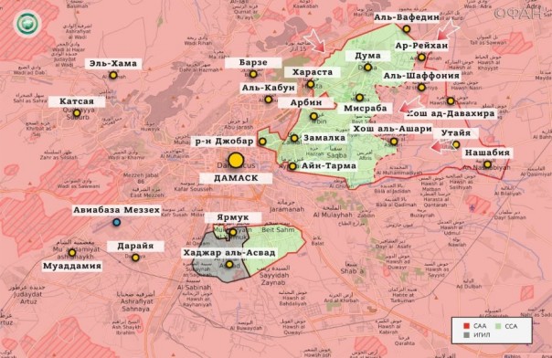 С востока через Масрабу прорываются подразделения дивизии «Tiger Forces», усиленные группами бойцов Республиканской гвардии, а с запада со стороны Харасты позиции джихадистов штурмуют части 4-й механизированной дивизии.