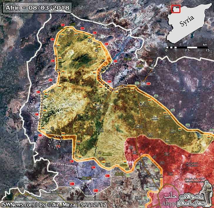 9 марта турецкие формирования продолжили пытаться блокировать Африн, проведя наступление к северо-востоку, западу и югу от подконтрольного YPG города.
