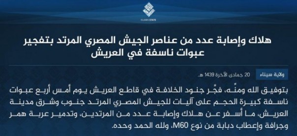 10.30 Боевики запрещенной в России организации ИГ совершили атаку на позиции египетских военных на Синае. В результате атаки террориста-смертника были серьезно повреждены танк, бульдозер и бронеавтомобиль силовиков.