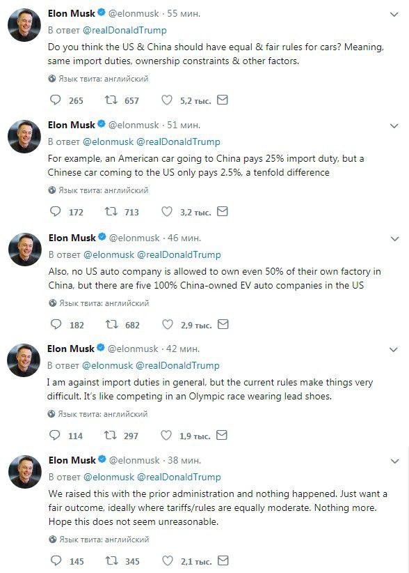Мы поднимали пошлины при предыдущей администрации и ничего не произошло. Я просто хочу справедливого результата, в идеале, когда тарифы/правила одинаково умеренные. Больше ничего. Надеюсь, это не кажется необоснованным".