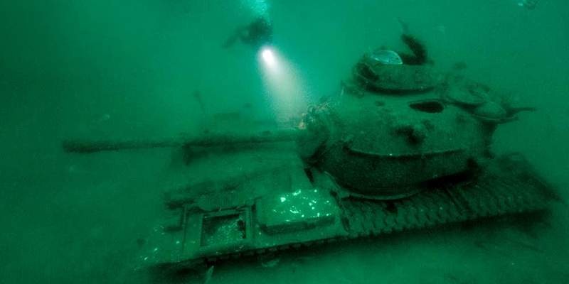 В 1994 году военные затопили сто танков М-60 в Мексиканском заливе (недалеко от залива Мобил). Потом, конечно, нарисовались «зелёные» и запретили такое надругательство над туристической зоной, но было уже поздно. Теперь на глубине от 21 до 33 метров можно наблюдать стройные бронированные ряды, которые, кажется, вот-вот отряхнут с себя всё наносное и пойдут в бой.