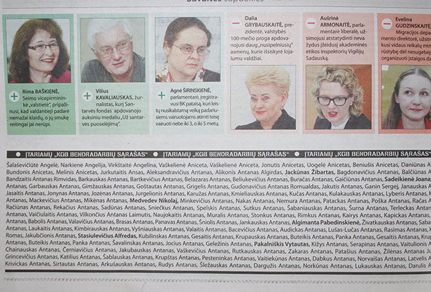 — Большинство политиков с ужасом относятся к разглашению фамилий сотрудников КГБ, поскольку это означало бы предательство людей, которые пришли с повинной, — пишет журналистка Эгле Самошкайте. — Сокрытие их данных было утверждено не только в законе от 23 ноября 1999 года, но и в заявлении Верховного Совета от 27 марта 1990 года, где сказано, что сознавшиеся не будут подвергаться моральным, юридическим и другим преследованиям со стороны властей Литовской Республики. «Фамилии, которые есть в списке секретных информаторов, никогда не будут официально подтверждены, если каким-то образом будут преданы огласке», — говорится в документе.