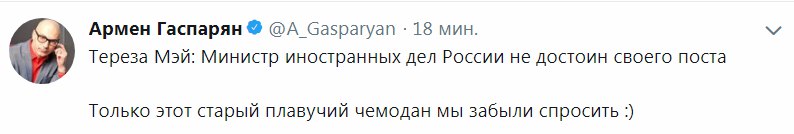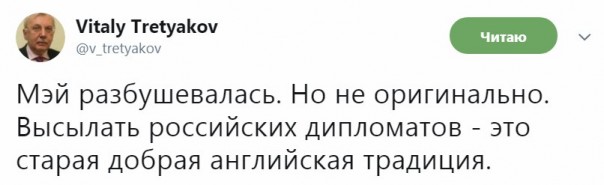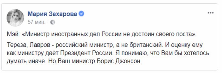Кстати. «Одно небольшое пояснение. Мэй "отозвала" приглашение Лаврову на посещение Великобритании. Только он его не принимал», - написала официальный представитель МИД РФ Мария Захарова.