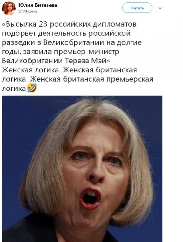 «Россия ответственна за этот отвратительный акт», - провозгласила в парламенте британский премьер-министр Тереза Мэй, имея в виду отравление предателя Сергея Скрипаля. Затем повторила ещё раз: «Нет никаких сомнений, что российское правительство виновно в покушении на господина Скрипаля и его дочь». Ни единого доказательства Мэй не привела, конечно. Но безапелляционно заявила, что Россия нарушила международное право и проявила агрессию в отношении Соединённого Королевства.