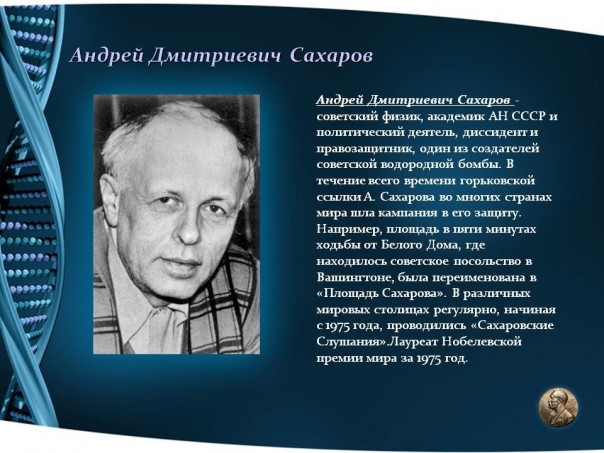 Сахаров, Андрей Дмитриевич (21 мая 1921, Москва — 14 декабря 1989, Москва) — советский физик-теоретик, академик АН СССР, один из создателей первой советской водородной бомбы. Общественный деятель, диссидент и правозащитник; народный депутат СССР, автор проекта конституции Союза Советских Республик Европы и Азии. Лауреат Нобелевской премии мира за 1975 год.