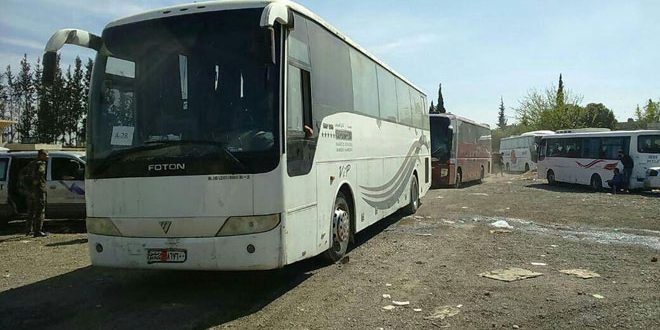 Накануне из Думы в Джараблус выехали 13 автобусов с 635 террористами «Джейш Аль-Ислам» и их семьями согласно соглашению, достигнутому после того, как террористы сдались в результате победы Сирийской Арабской армии в масштабной операции по очистке Восточной Гуты от терроризма. SANA