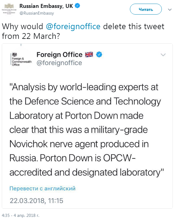 И хотя официально в «Форин-офисе» объяснили удаление сообщения некорректной передачей слов британского посла в России Лори Бристоу во время брифинга 22 марта, в действительности, от своих слов пришлось фактически отказаться Борису Джонсону, так как именно он утверждал, что химики «Портон-Даун» уже идентифицировали «Новичок» и доказали его российское происхождение. Как отметила Мария Захарова, таким образом, МИД Великобритании сознался, «что принимал решение о виновности России на основе подозрений».