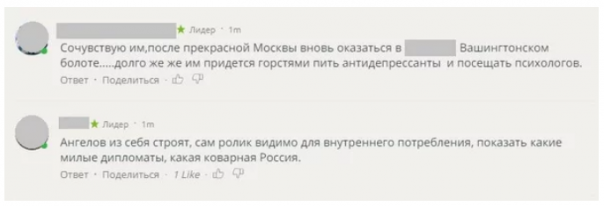 Один из комментаторов написал, что дипломаты США льют «крокодиловы слезы». Другой поддержал действия Кремля, отметив, что дипломаты США, по сути, это наверняка сотрудники ЦРУ, и не стоит им позволять вести деятельность внутри страны.