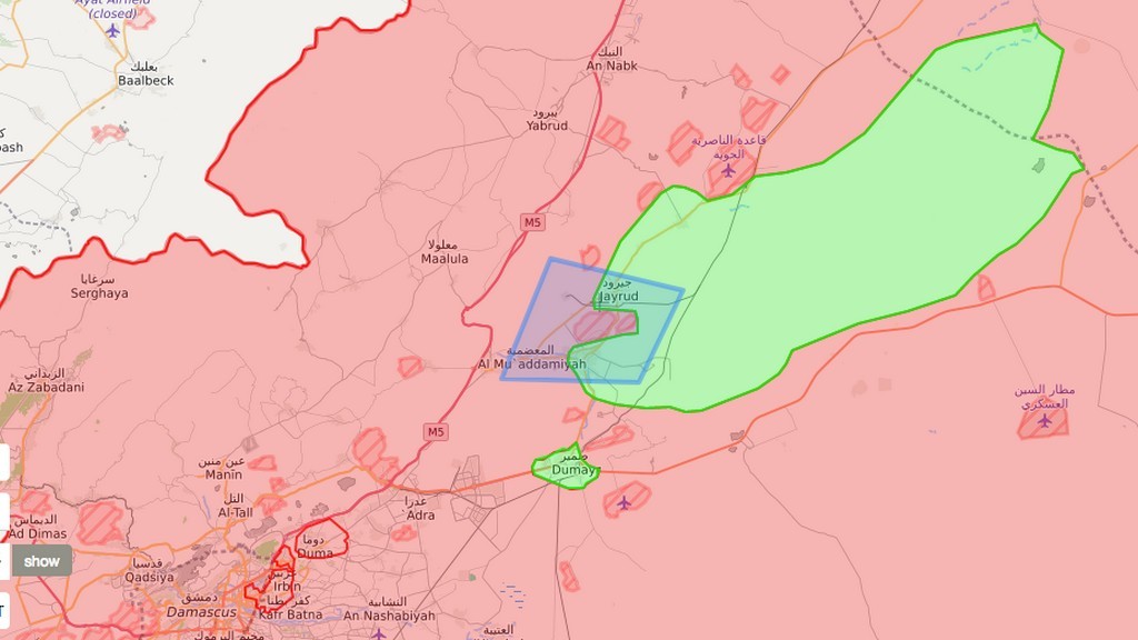 Между тем на востоке региона началась эвакуация боевиков «Джейш Аль-Ислам» из населенного пункта Думейр. Как передает на своей странице в сети Twitter военный источник (Syrianow10), радикалы вместе со своими семьями покинули город на 32 автобусах и направились в сторону города Джараблус в провинции Алеппо.