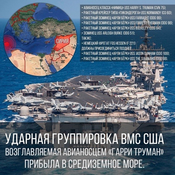 Напомним, что возглавляемая авианосцем «Гарри Трумэн» группа выдвинулась в район Средиземного моря с военно-морской базы в Норфолке (штат Вирджиния) 10 апреля.