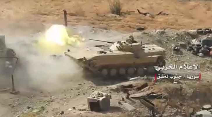 Подразделения 4-й механизированной дивизии ведут огонь по позициям ИГ на юге Дамаска из установок «Голан»
