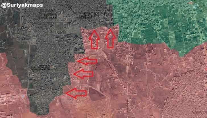 Штурмовым отрядам силовиков удалось прорвать оборону боевиков ИГ* на широком участке фронта между Хаджар-эль-Асвадом и городом Ялда. Армейцами были заняты фермы вплоть до района Аль-Баваек. Кроме того проправительственные силы прорвались мимо пригорода Мезвита и вошли в район Такаддом на юге анклава.