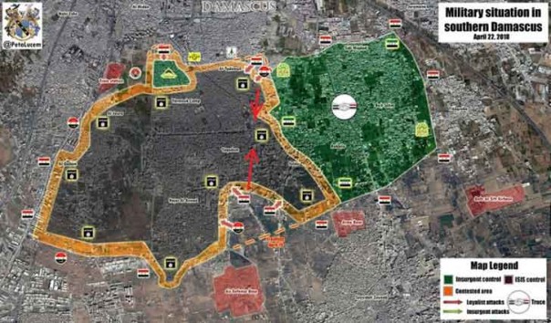 42-я механизированная бригада, которую еще называют «танковый спецназ» и палестинские формирования «Ливаа аль-Кудс» атаковали на юго-востоке в районе Хаджар аль-Асвад, в то время, как подразделения 105-й бригады Республиканской гвардии и отряды Фронта освобождения Палестины штурмуют позиции «Исламского государства»* в районе Аль-Кадам.