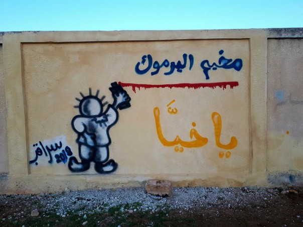 А на улицах Саракеба, контролируемого боевиками, появились граффити в поддержку лагеря Ярмук, Дамаск. На рисунке изображен палестинский мультипликационный герой и надпись гласит : «Лагерь Ярмук. О, брат».