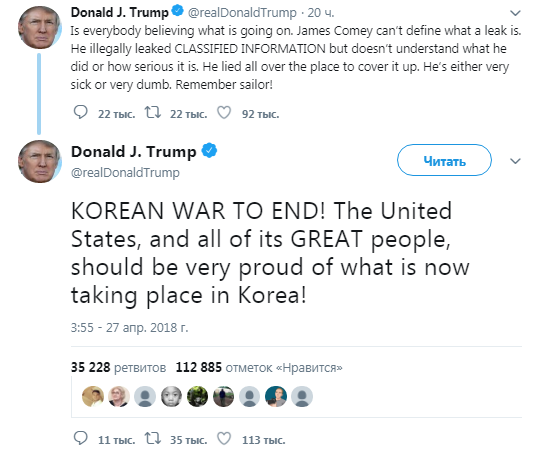 Напомним, что в своем Twitter американский лидер назвал встречу корейских лидеров исторической, после чего под этой записью стали появляться призывы от пользователей вручить президенту такую награду.