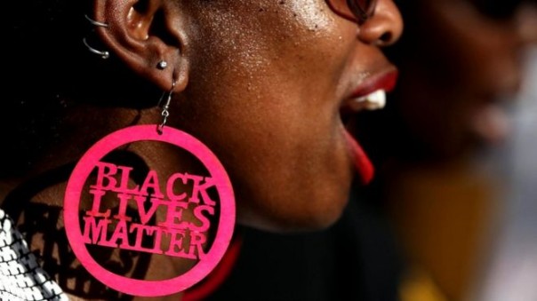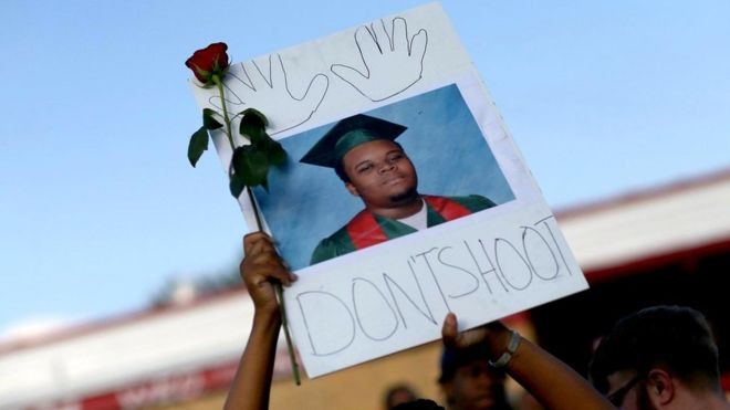 Участник демонстрации держит над головой портрет 18-летнего Майкла Брауна, застреленного в 2014 году в городе Фергюсон, штат Миссури, полицейским