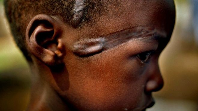 Огнестрельное оружие — вовсе не обязательное условие насилия, как свидетельствует эта фотография ребенка из племени хуту, на лице которого шрам от мачете, полученный в 1994 году, во время руандийского геноцида
