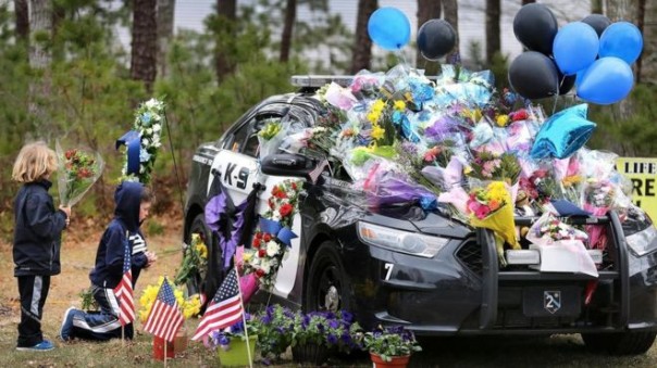Дети возлагают цветы к автомашине массачусетского полицейского Шона Гэннона, застреленного в апреле 2018 года, когда он пытался вручить ордер на арест