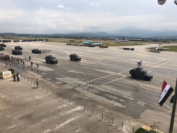 В параде приняли участие офицеры управления группировки войск и тактической группы, летчики смешанного авиационного полка, военнослужащие зенитного ракетного полка, медицинского отряда специального назначения, сводный парадный расчет военнослужащих-женщин, подразделения военной полиции ВС РФ, военнослужащие вооруженных сил Сирийской Арабской Республики.