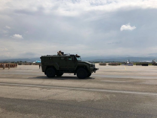 В составе механизированной колонны прошли современные образцы российской военной техники, среди которых бронеавтомобили «Тайфун», «Тигр», БТР-82АМ и другие образцы военной техники стоящие на вооружении.